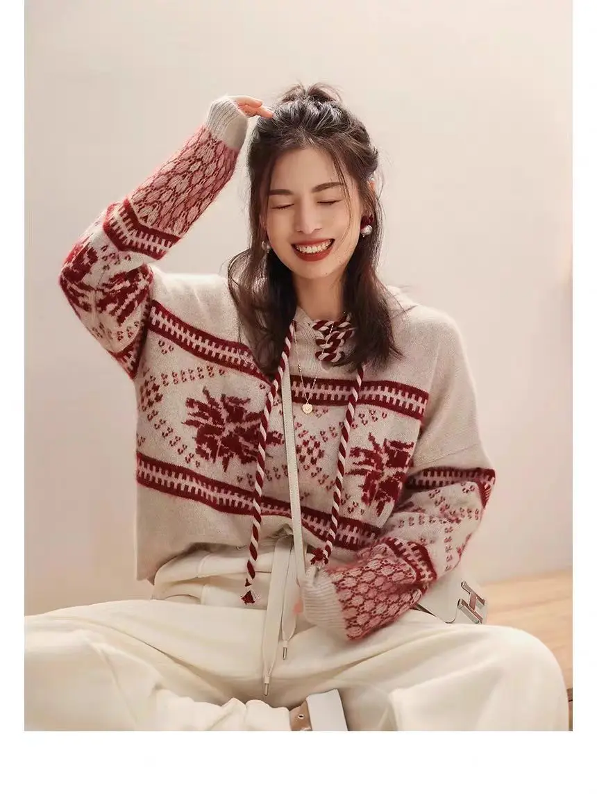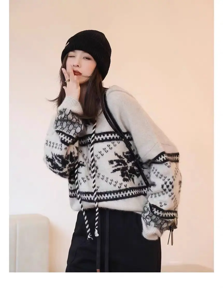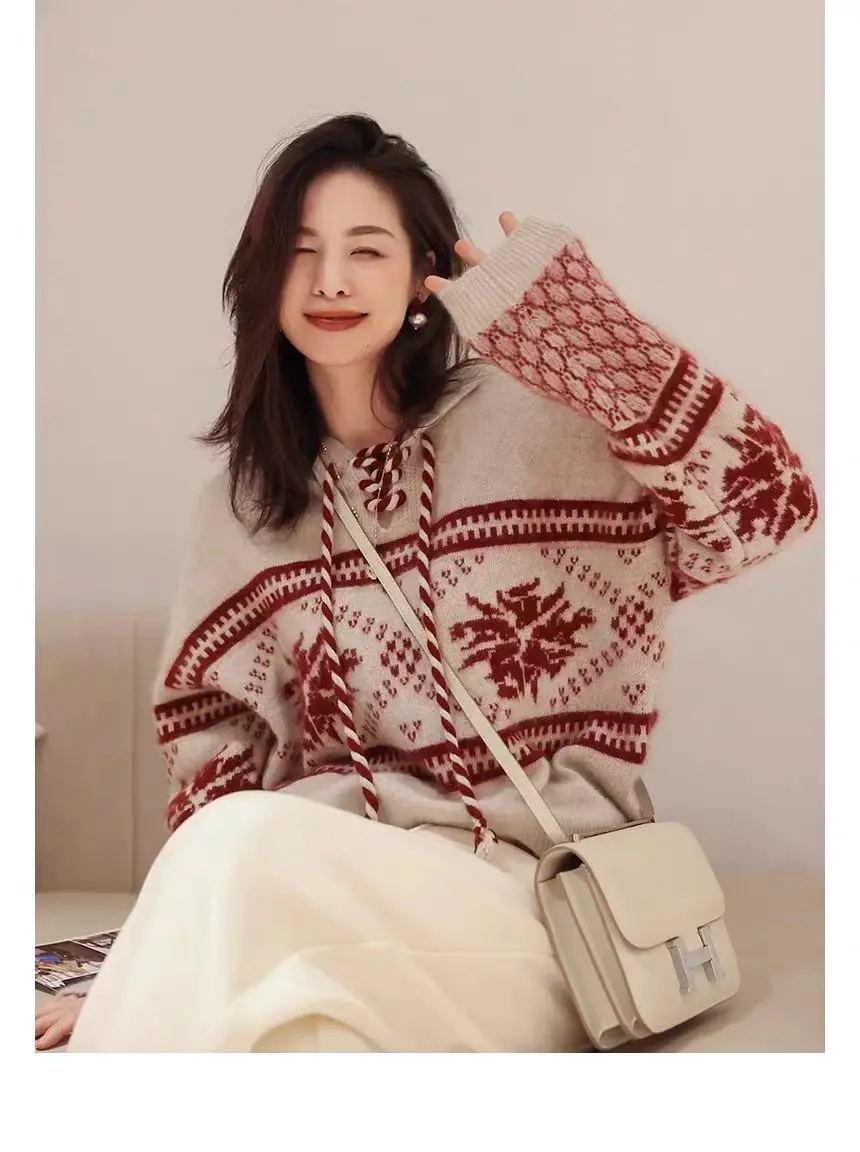 100% pure wool cashmere sweater women's 2024 autumn and winter new hooded collar pullover fashionable loose knit plus size top