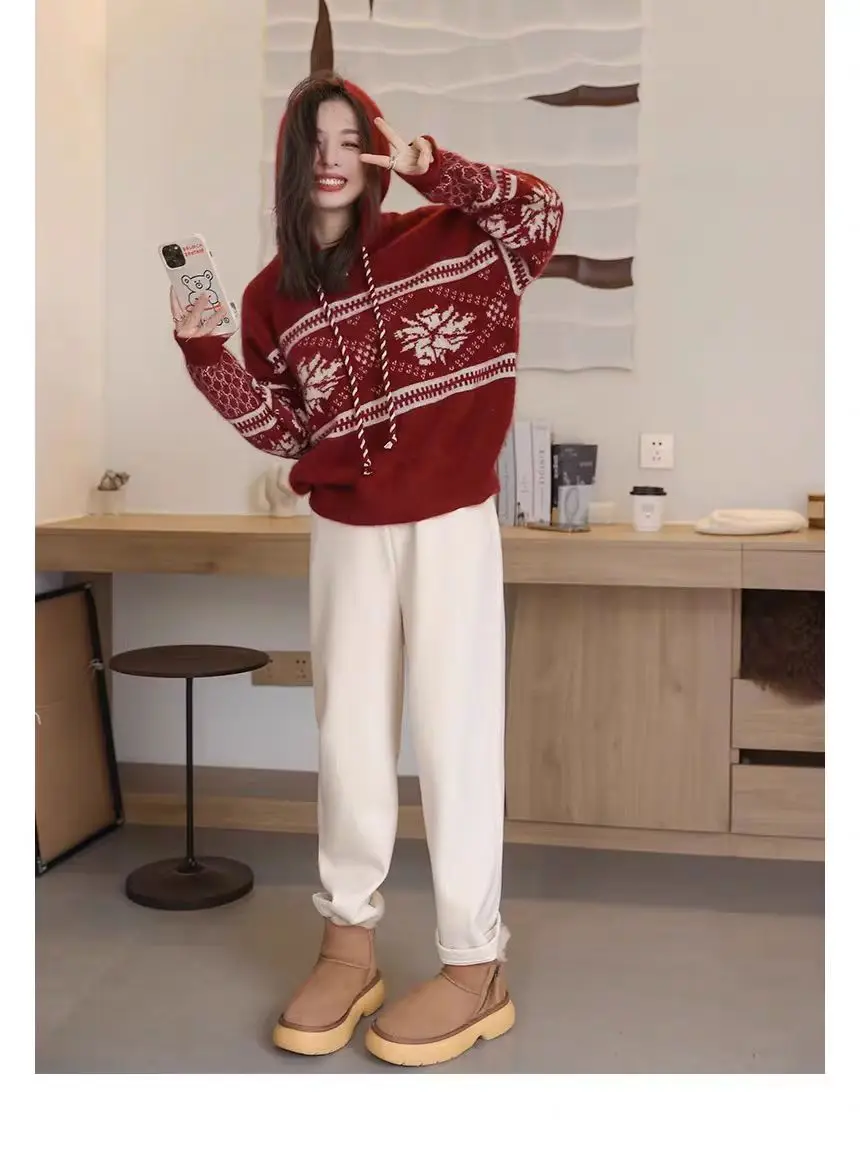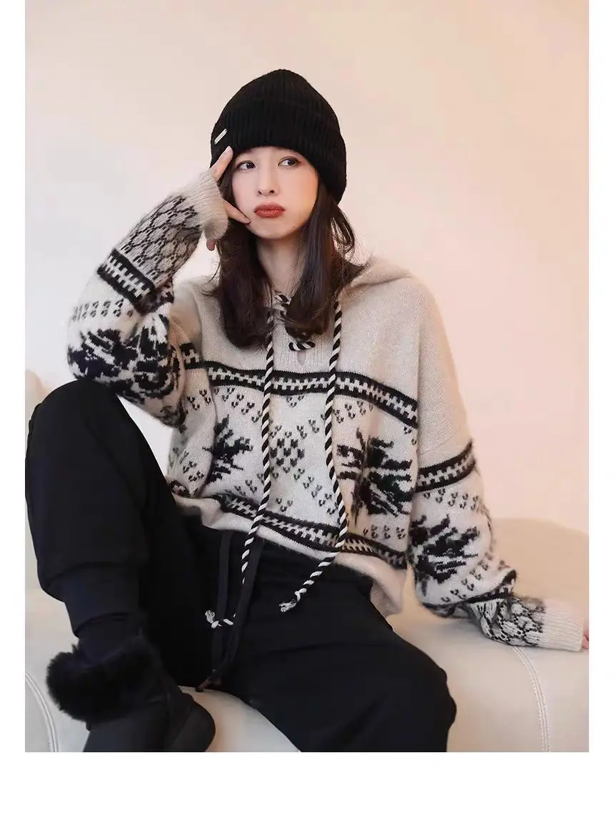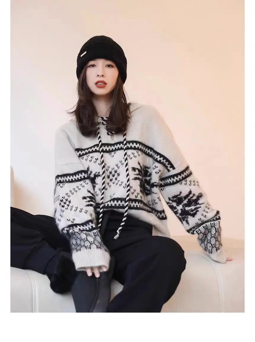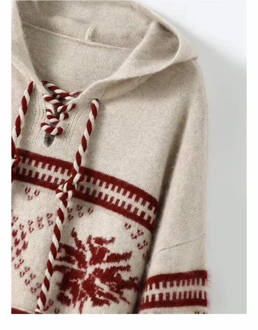 100% pure wool cashmere sweater women's 2024 autumn and winter new hooded collar pullover fashionable loose knit plus size top