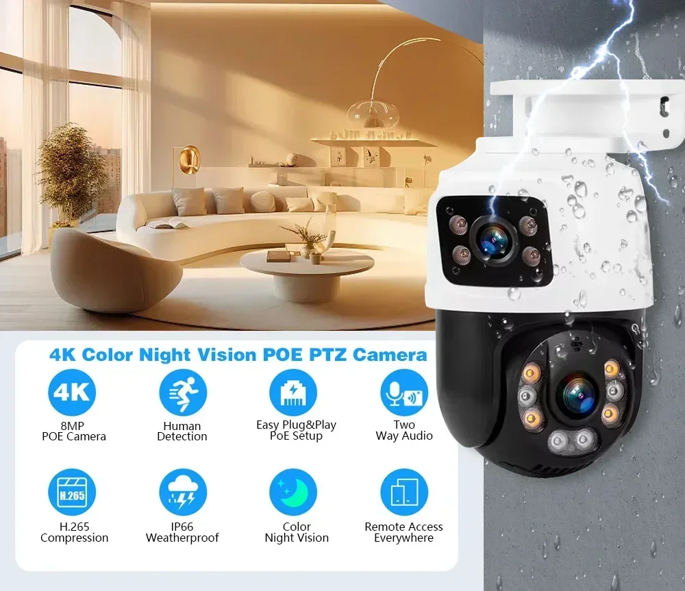 8MP 4K Dual Lens POE IP Camera PTZ Dual Screens Smart Home 360° Wired Video Surveillance IP Camera Motion Detection CCTV ICsee