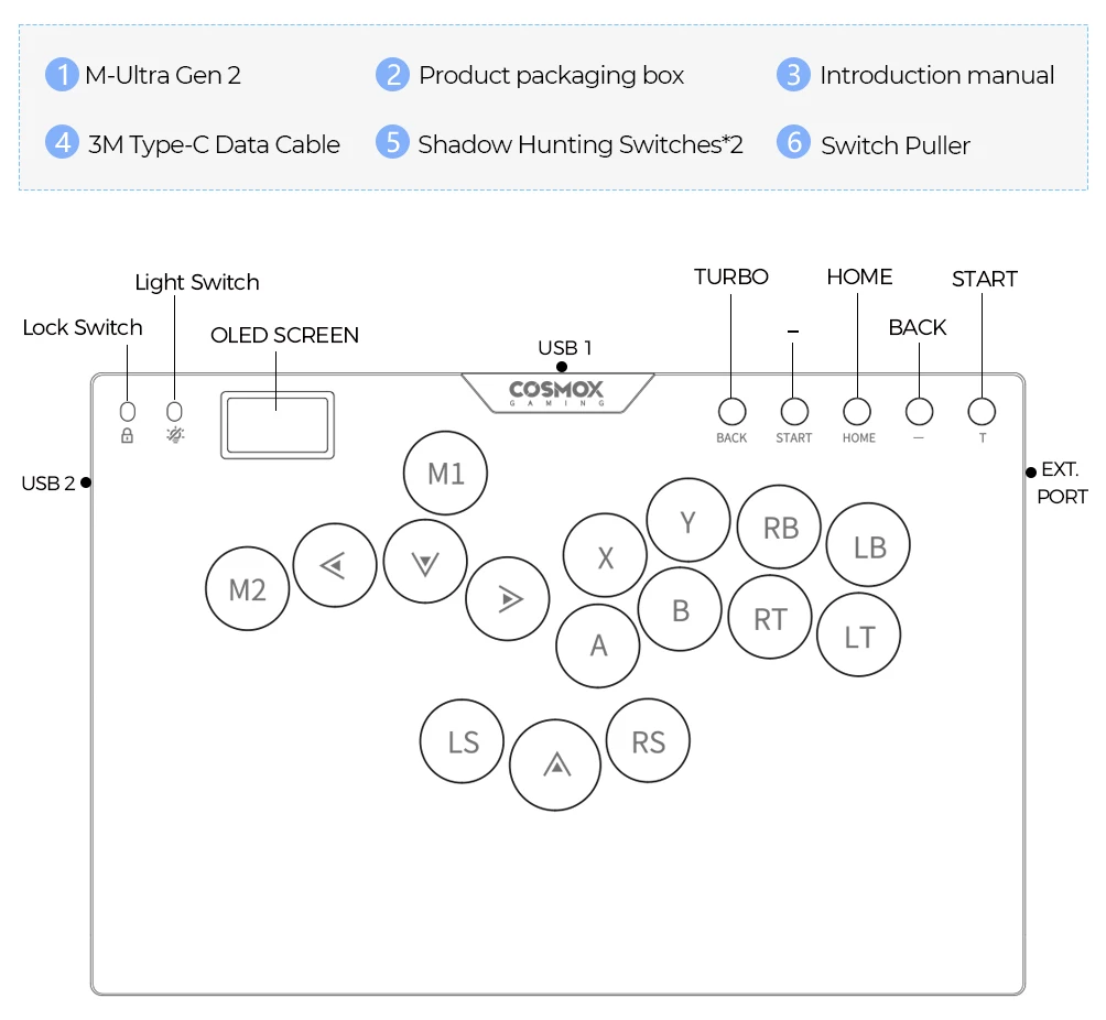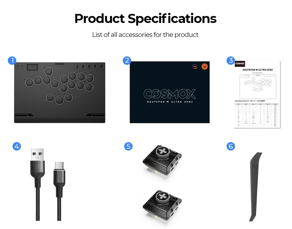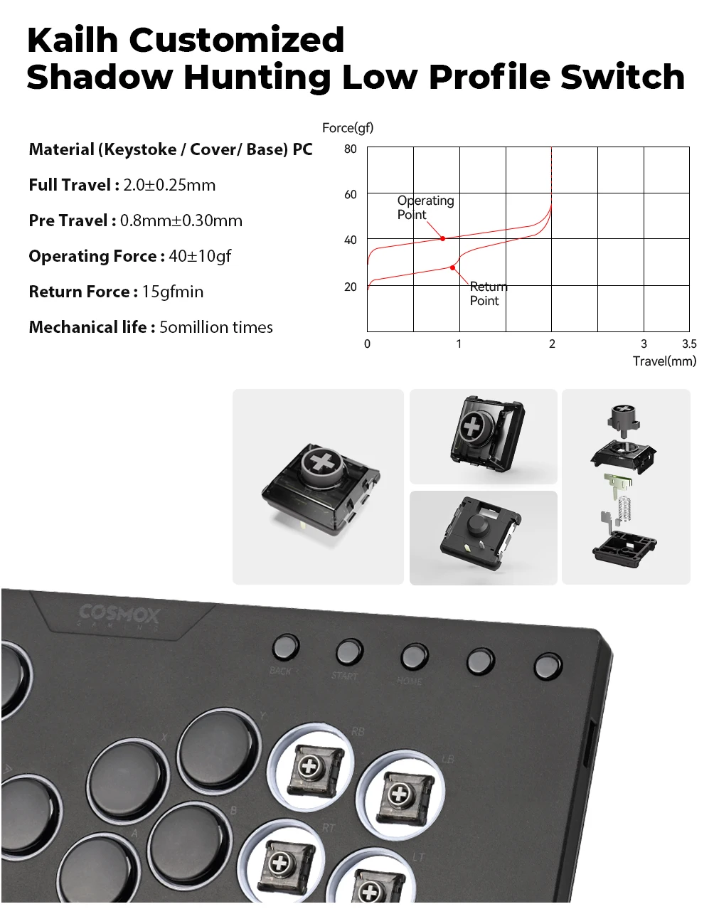 Product Specifications: Leverless Controller*1 , 3M Data Cable *1 ,Keycap Puller*1 , Shadow Hunting Switch *2