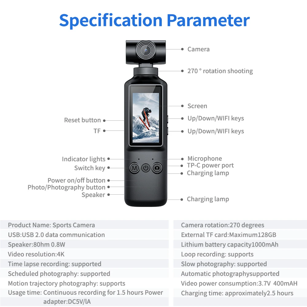 3. 270° rotatable lens of the sports camera for flexible shooting angles.