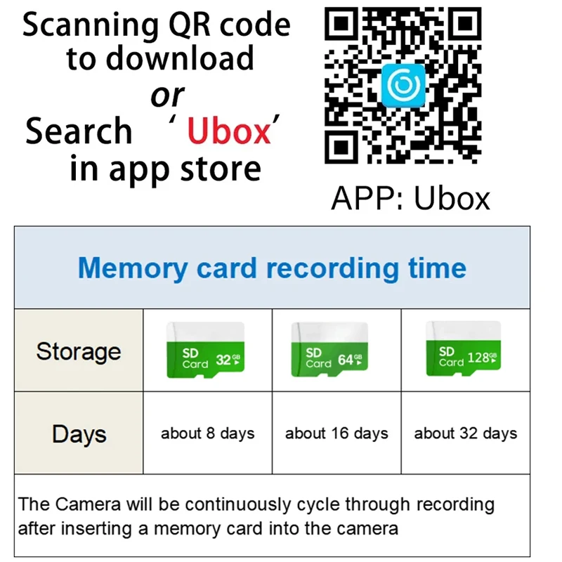 【360 Degree Rotation & SD Card/Cloud】solar camera equipped with 355°pan and 120°tilt ,you could control the direction by the UBOX APP.Supports 32-128G SD card (not included),also support select cloud storage method to record.
