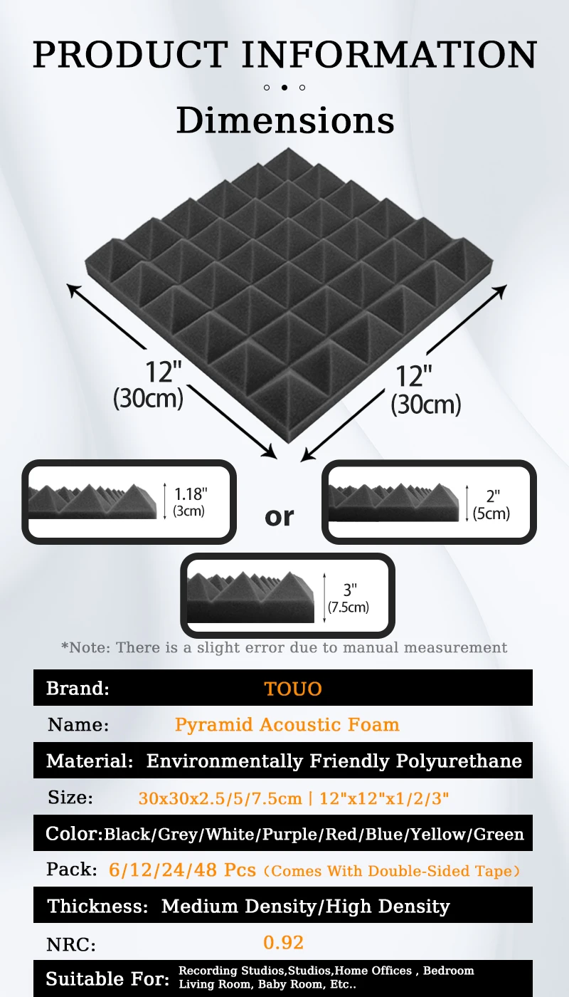 TOUO Acoustic Foam 6-48 Pcs Sound Proof Wall Panels High Density Studio Sound Absorbing Material Acoustic Foam Home Decoration