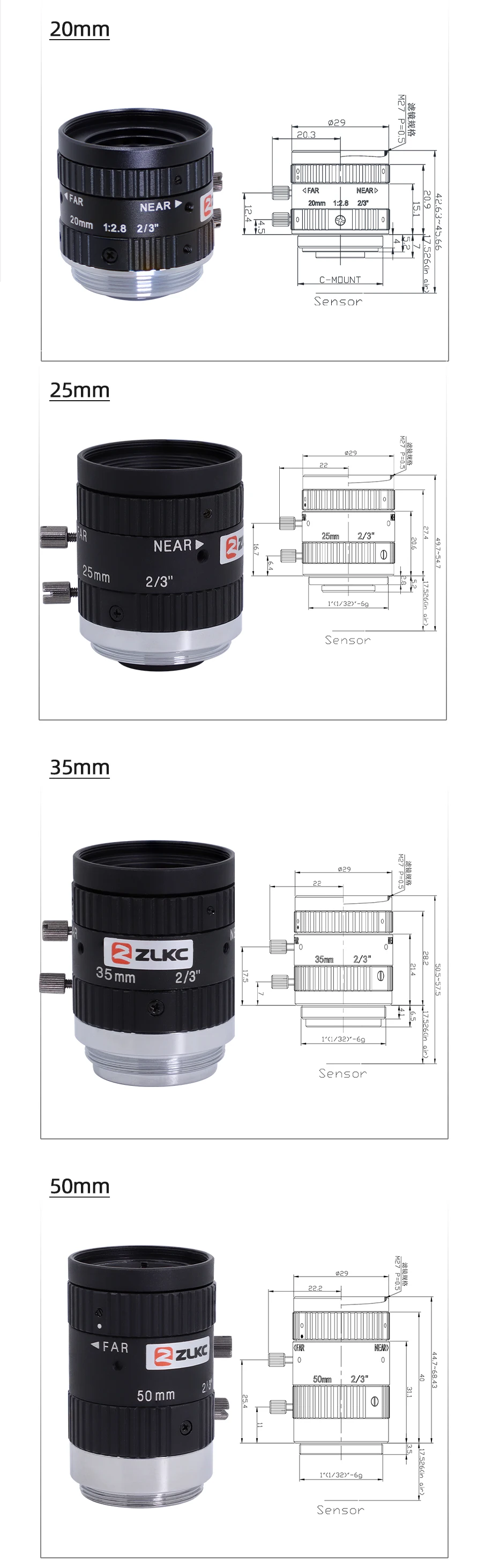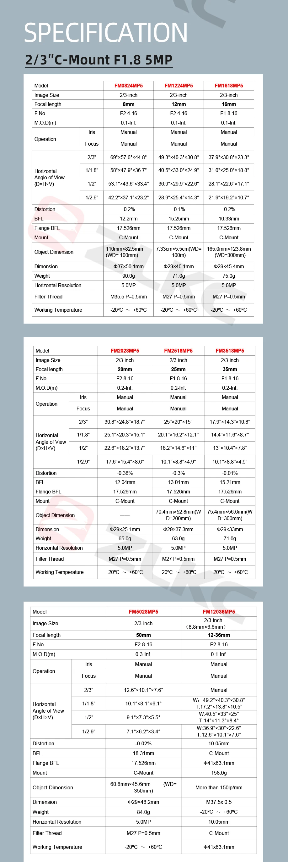 MODEL: FM-MP5( 5 MP 8mm 12mm 16mm 20mm 25mm 35mm 50mm 12-36mm 2/3'' C-Mount F1.8/F2.4 Machine Vision/FA Lens )