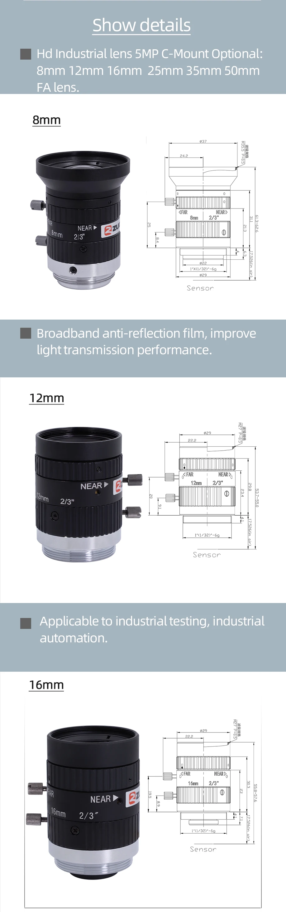 1.HD 5megapixel lens,8mm 12mm 16mm 20mm 25mm 35mm 50mm Fixed Focal Length and